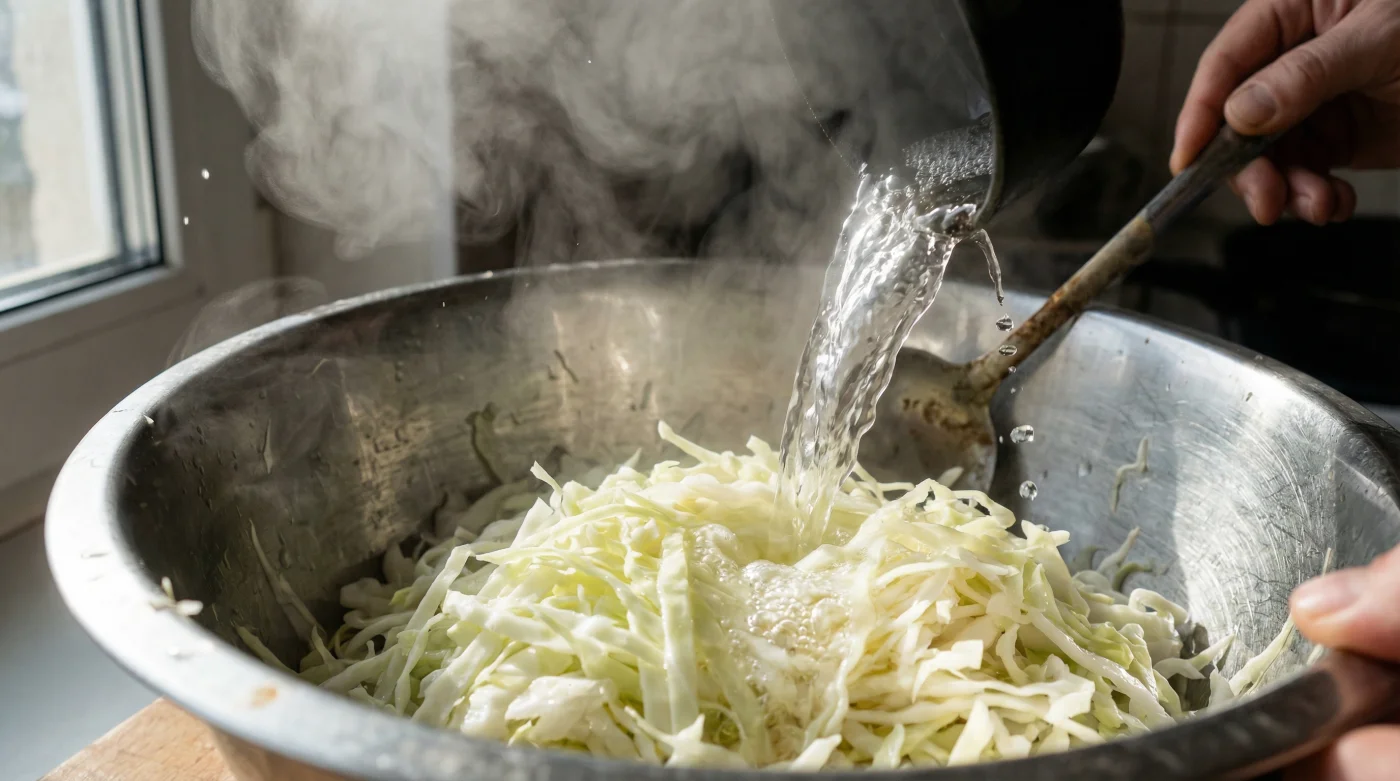 Nimm den Topf vom Herd und gieße den heißen Sud in einem Schwung direkt über den feinen Kohl. Du wirst sofort dieses leise, befriedigende Knistern hören. Mische alles zügig mit zwei großen Löffeln durch, damit jede einzelne Faser die Hitze spürt und vom Sud benetzt wird.