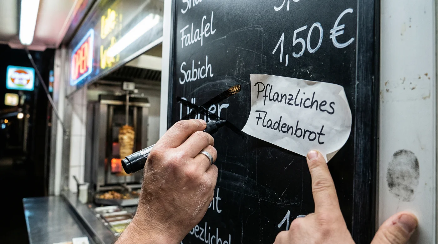 Es ist Freitagabend. Du stehst vor dem beleuchteten Schaufenster deines Lieblingsimbisses um die Ecke. Der Geruch von geröstetem Kreuzkümmel, warmem Fladenbrot und scharfem Paprikapulver liegt schwer in der kalten Abendluft. Das vertraute Surren des elektrischen Messers schneidet durch das Rauschen des Stadtverkehrs, während das Fett leise auf den Grill tropft. Dein Blick wandert über die leuchtende Menütafel, auf der Suche nach deinem Stammgericht. Doch dort, wo gestern noch in klaren Lettern “Veganer Döner” stand, klebt heute ein provisorischer Streifen schwarzes Isolierband. Ein hastig mit Kreide geschriebenes “Pflanzliche Drehspieß-Art im Fladenbrot” prangt direkt daneben. Du blinzelst. Was sich im ersten Moment wie ein schlechter Scherz deines Kiez-Gastronomen anfühlt, ist in Wahrheit die stille, aber gewaltige Ankunft eines neuen Lebensmittelgesetzes, das die deutsche Gastronomie über Nacht verändert hat.