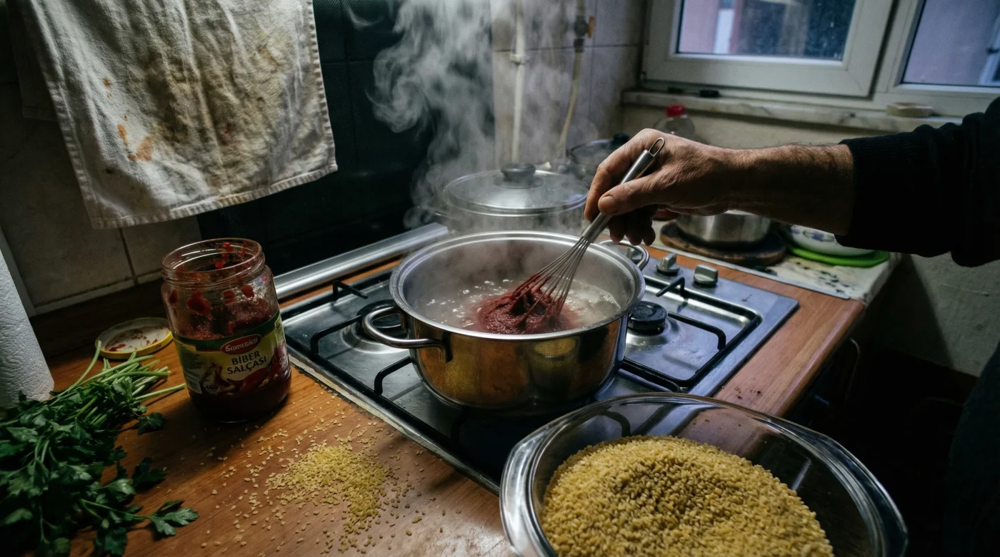 Der wahre Experte weiß: Die Geschmacksexplosion beginnt schon vor dem Quellen. Das Geheimnis liegt darin, das Tomatenmark und idealerweise auch etwas Paprikamark mit einem Schneebesen direkt in das kochende Wasser einzurühren. Aus dem klaren Wasser wird so eine hochkonzentrierte, kochende Würzbrühe. Erst diese leuchtend rote Flüssigkeit wird über den Bulgur gegossen.