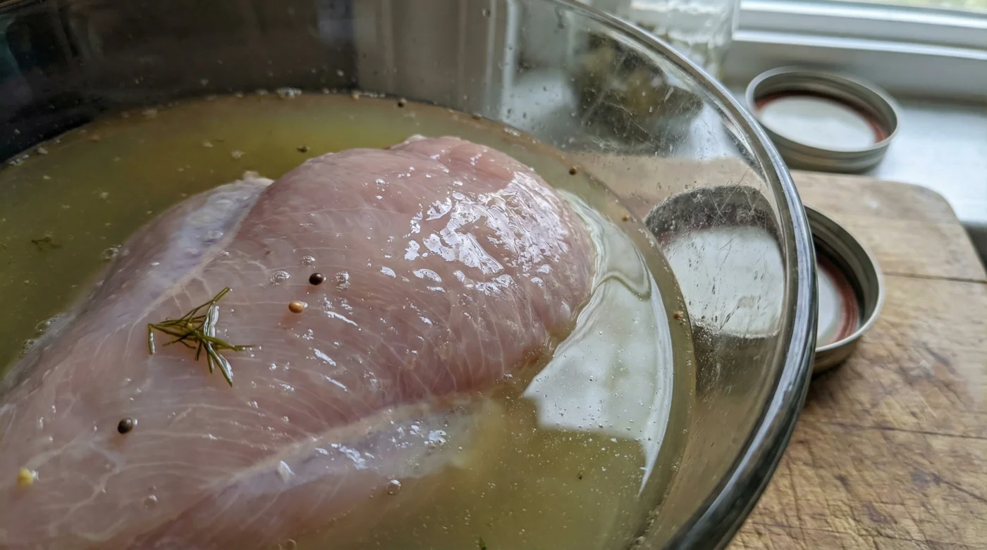 | Das Fleisch wirklich komplett in der Flüssigkeit untertauchen lassen. | Die Putenbrust nach dem Bad unter fließendem Wasser abwaschen (das spült die feinen Aromen weg). |
