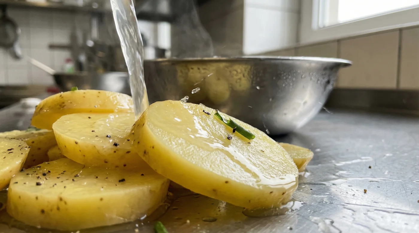 Beim ersten vorsichtigen Umrühren brechen die Kanten ab. Beim zweiten Rühren verschwindet die klare Textur vollständig. Plötzlich hast du keinen eleganten Salat mehr vor dir, sondern einen geschmackvollen, aber optisch traurigen Brei. Die Frustration ist greifbar. Generationen von Rezepten haben uns gepredigt, dass warme Kartoffeln zwingend heiße Brühe brauchen, um den Geschmack aufzusaugen. Es klang immer logisch. Doch genau hier liegt der fundamentale Fehler, der uns den Weg zur perfekten, restaurantreifen Präsentation verbaut.