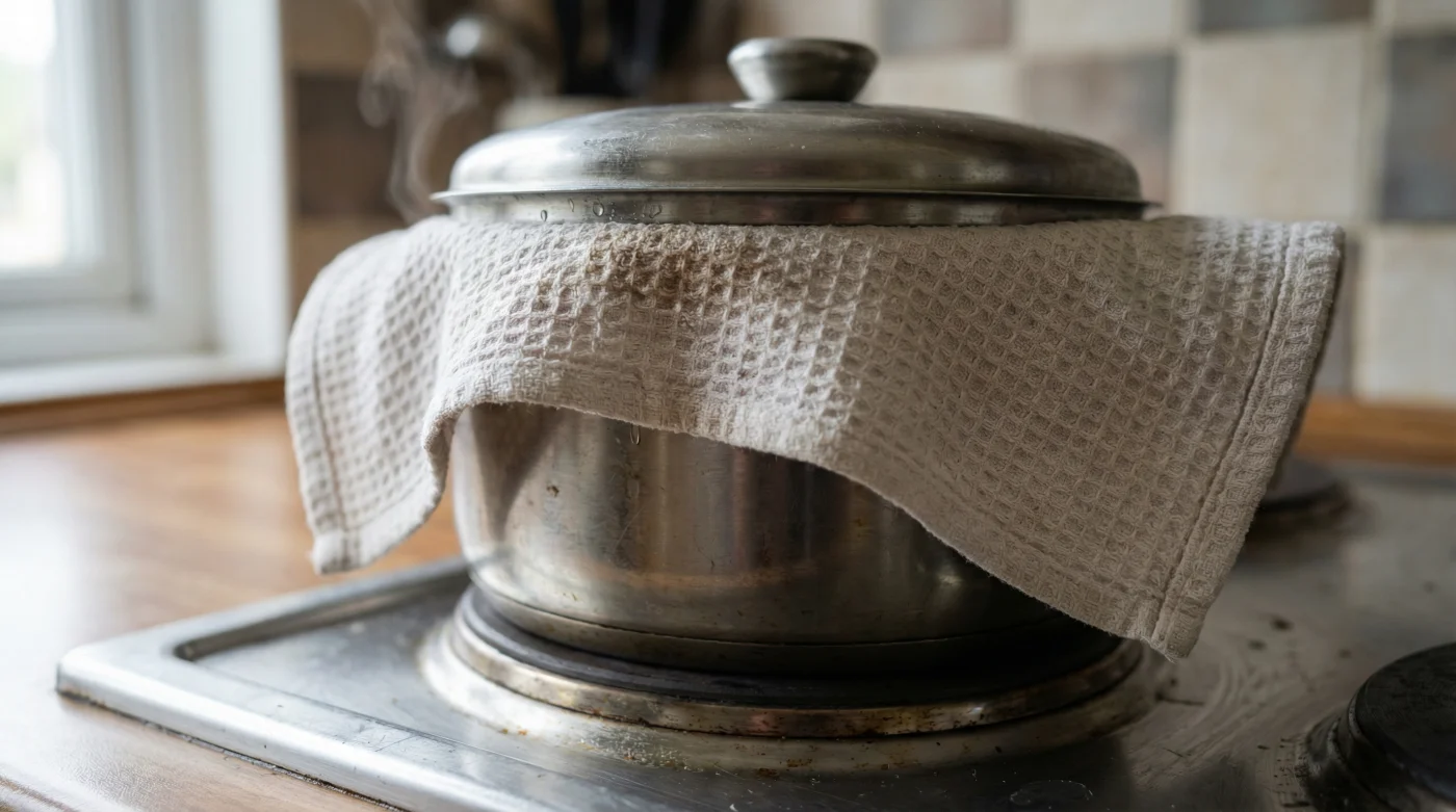 Nimm ein absolut sauberes, vollständig trockenes Baumwolltuch zur Hand. Hebe den Deckel für einen kurzen Moment an, lege das Tuch fest und straff über den Topf und drücke den Deckel kräftig darauf, sodass er bündig abschließt. Schlage die überstehenden Enden des Tuches unbedingt über dem Deckelgriff zusammen oder verknote sie dort, damit sie unter keinen Umständen in die Nähe der heißen Herdplatte geraten. Das Stofftuch bildet ab diesem Moment eine hochgradig absorbierende Barriere zwischen dem Deckel und deinem Essen.