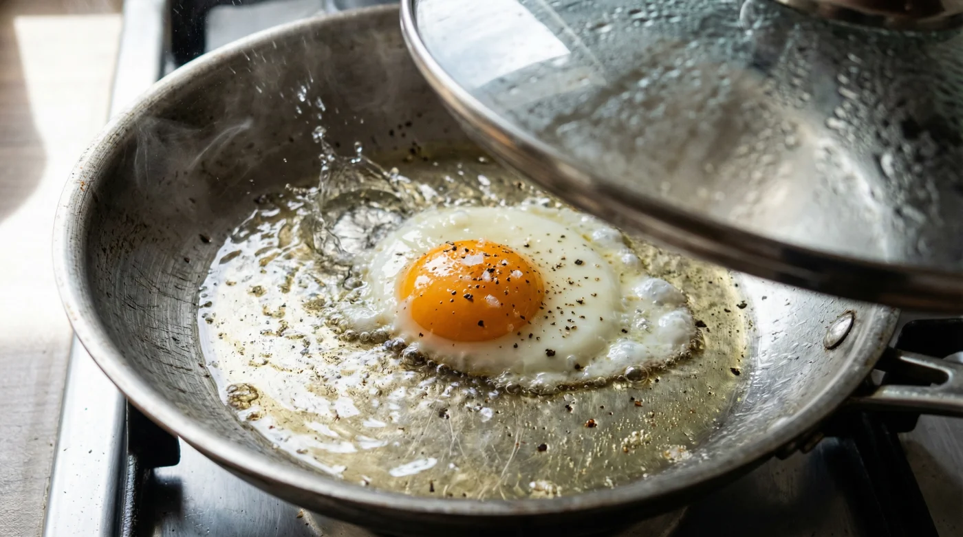Warte genau den Moment ab, in dem der äußere Rand des Eiklars beginnt, weißlich und fest zu werden. Jetzt kommt der entscheidende Handgriff. Gib vorsichtig einen einzigen Esslöffel Wasser in eine freie Ecke der heißen Pfanne. Gieße das Wasser niemals direkt auf das Ei.