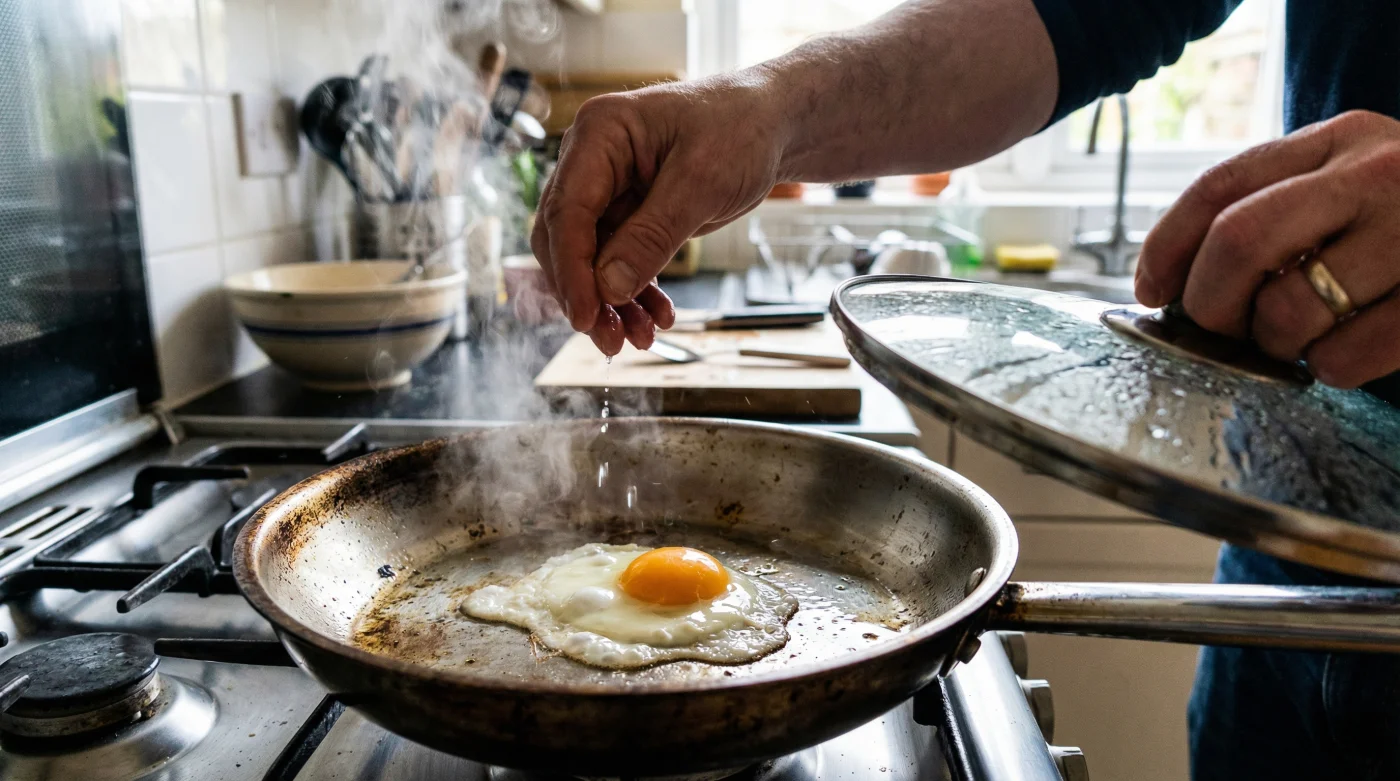 Ein ruhiger Sonntagmorgen. Das fahle Licht fällt durch das Küchenfenster, der Duft von frisch gemahlenem Kaffee mischt sich mit dem erdigen Aroma von geröstetem Sauerteigbrot. Die Butter knistert leise in deiner schweren gusseisernen Pfanne. Du schlägst ein Ei am Pfannenrand auf und lässt es zischend hineingleiten. Das Eiweiß breitet sich aus, die Ränder beginnen sofort zu bräunen und werfen kleine Blasen. Doch dann passiert es, wie so oft: Während der Boden bereits bedrohlich dunkel und knusprig wird, wabert auf der Oberseite noch eine durchscheinende, glibberige Schicht Eiweiß. Du wartest. Du reduzierst die Hitze. Nichts passiert. Schließlich greifst du hektisch zum Pfannenwender, versuchst das Ei in einem verzweifelten Akt zu wenden – und das Eigelb platzt. Ein goldenes Trauerspiel ergießt sich auf das raue Metall. Die Illusion vom perfekten, makellosen Hotel-Frühstück ist in Sekundenbruchteilen dahin.