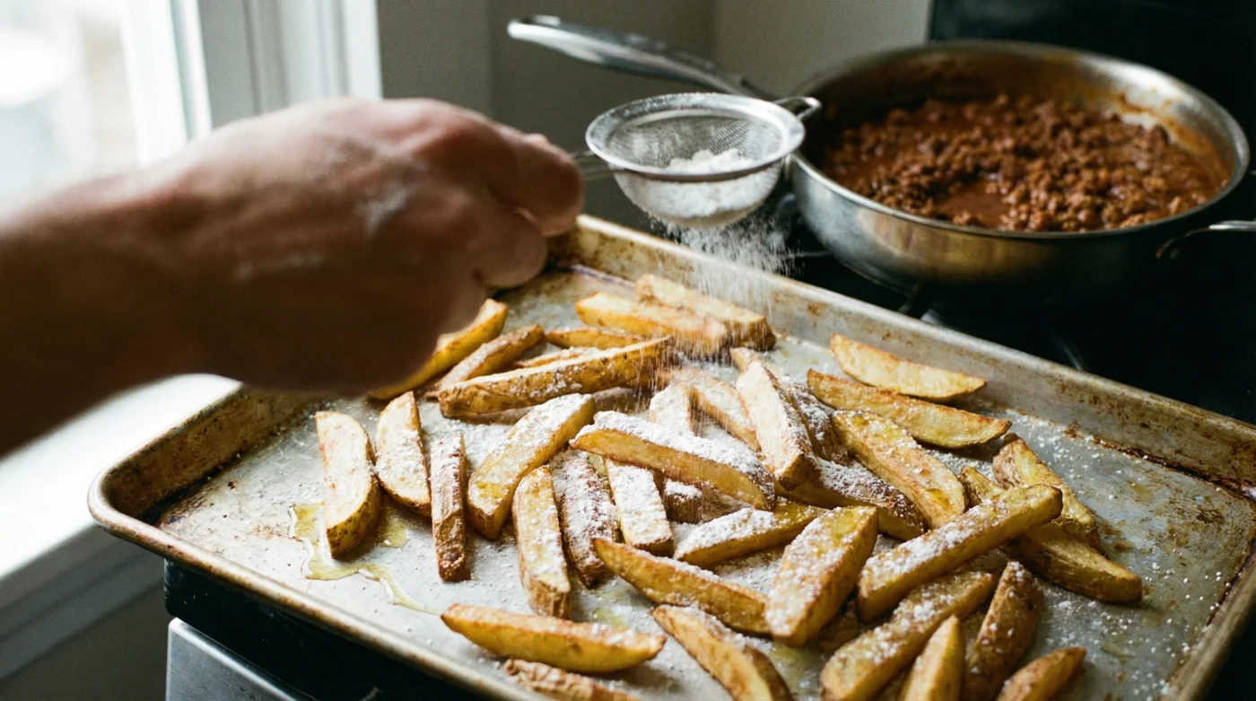 Nimm nun ein feines Küchensieb zur Hand. Gib ein bis zwei Esslöffel reine Speisestärke hinein. Maisstärke funktioniert durch ihre feine Molekularstruktur am zuverlässigsten. Stäube nun einen leichten, fast transparenten Nebel über die rohen oder angefrorenen Pommes frites in einer großen Schüssel. Weniger ist hier mehr. Es geht nicht um eine Panade, sondern um eine mikroskopische Grundierung.