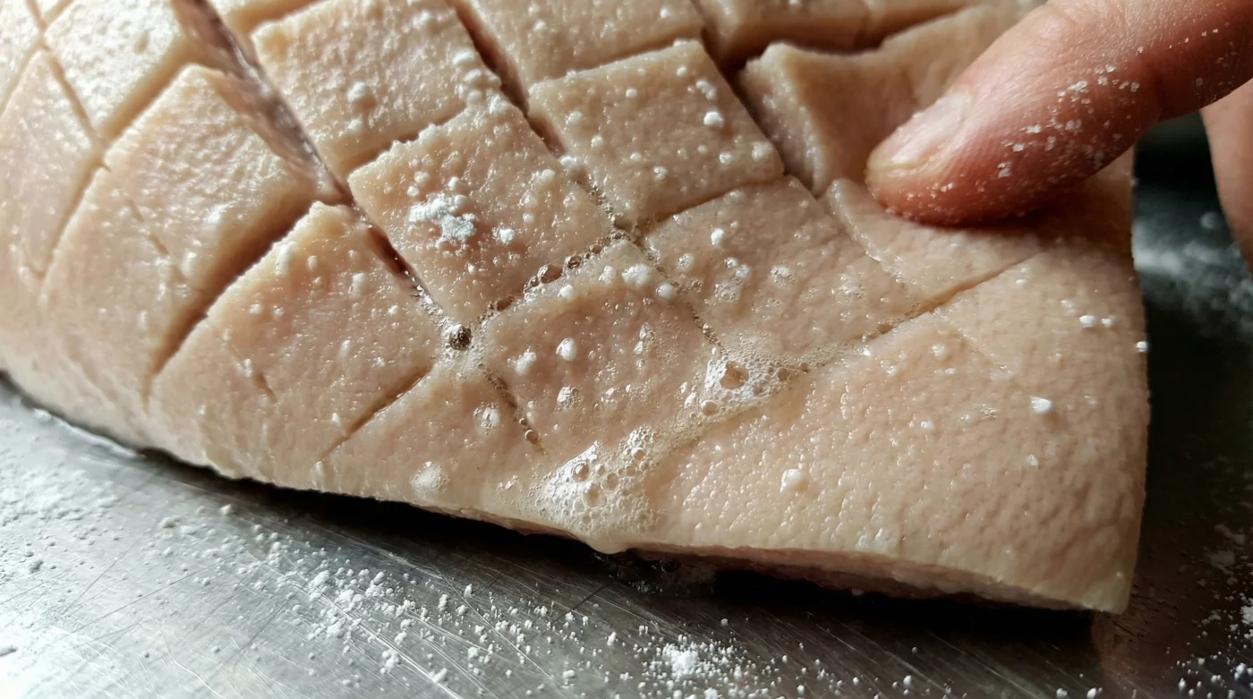 Vermische nun genau einen gestrichenen Teelöffel reines Backpulver mit deinem gewohnten, feinen Salz. Gib diese Mischung auf die Schwarte. Jetzt ist echte Handarbeit gefragt: Massiere das Pulver tief in die eingeschnittenen Rillen ein. Reibe es mit den Daumen in das Raster, als würdest du eine alte, wertvolle Ledertasche pflegen. Das Backpulver beginnt sofort zu arbeiten. Es hebt den pH-Wert der dicken Haut an, beschleunigt den Abbau der festen Proteine und schwächt die Struktur der Schwarte, sodass sie später dem Dampfdruck von unten keinen Widerstand mehr leisten kann.