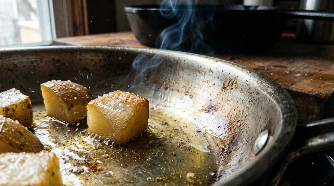 Rohe Bratkartoffeln haben ihren eigenen Reiz, erfordern aber extrem viel Geduld bei niedrigerer Hitze und brennen leicht an. Das Vorkochen mit der Essig-Methode garantiert dir ein weiches, cremiges Inneres und eine absolut krosse Außenhülle, ganz ohne harte, rohe Überraschungen im Kern.