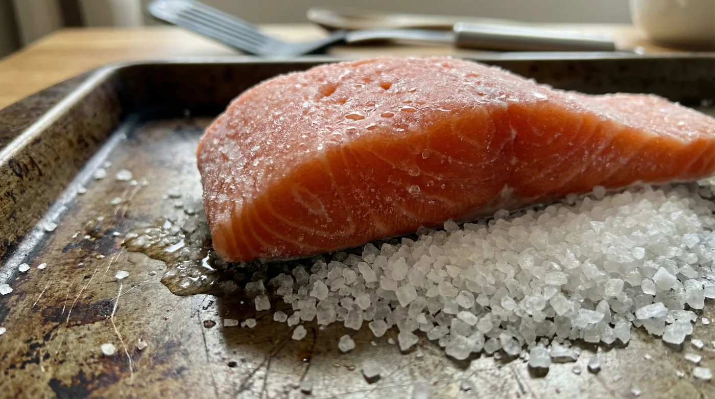 Die Lösung für dieses Problem ist grob, strahlend weiß und kostet im Supermarkt nur wenige Cent: Ein dickes, stoisches Bett aus grobem Meersalz. Das Salz wirkt wie ein massives, saugfähiges Kissen. Es nimmt das überschüssige Schmelzwasser sofort auf, sobald es entsteht, und verwandelt sich dabei in eine sanfte, feuchte Dampfkammer, die den Lachs von unten wärmt und gleichmäßig umschließt, ohne ihn zu wässern.