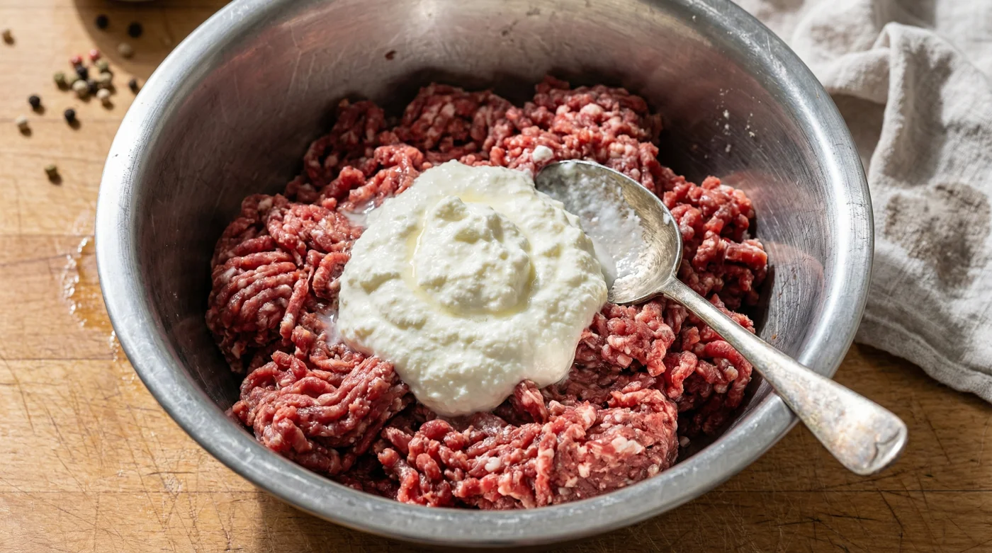 Gerade bei Geflügel ist dieser einfache Handgriff Gold wert! Da Hähnchen- oder Putenhack extrem fettarm ist, verhindert der Quark das sonst typische, faserige und trockene Gefühl beim Kauen.