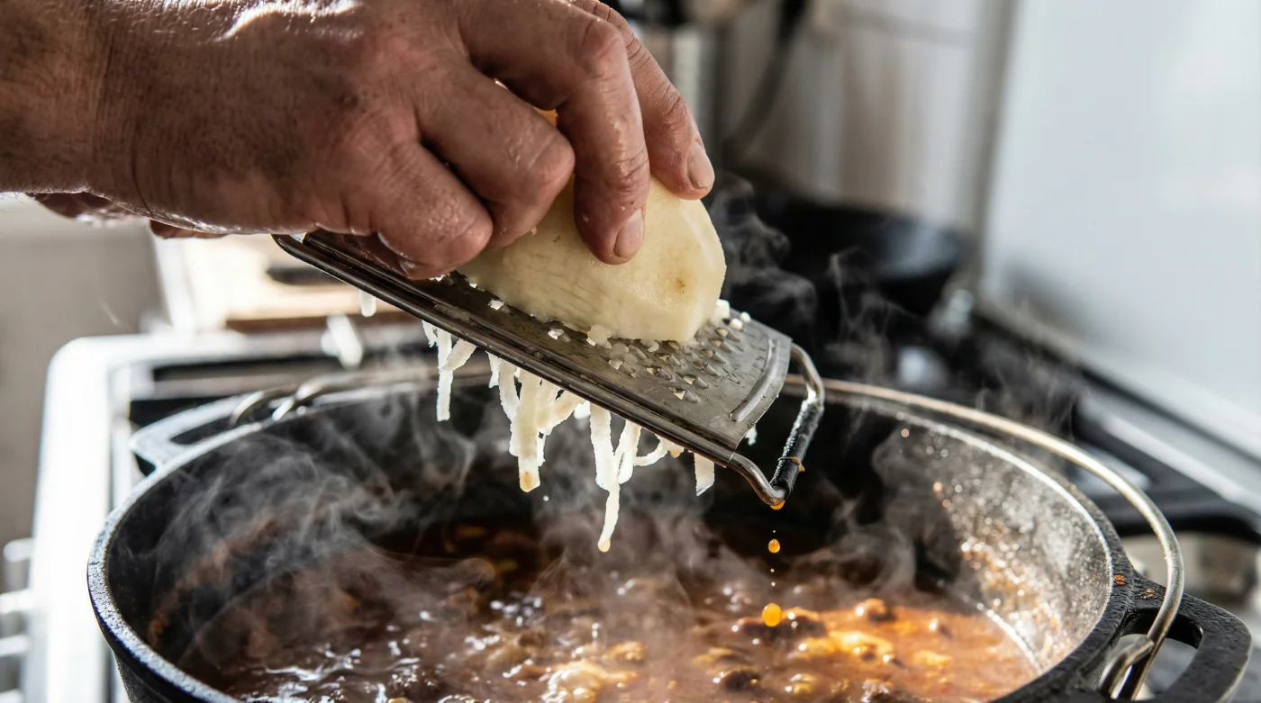 Der Trick, den Josef mir zeigte, ist so einfach wie genial. Wenn du eine rohe Kartoffel auf der allerfeinsten Seite deiner Küchenreibe direkt in die leicht köchelnde Gulaschsuppe reibst, passiert pure Physik. Du zerstörst mechanisch die Zellwände der Kartoffel. Die darin enthaltene, hochkonzentrierte Stärke wird sofort freigesetzt.