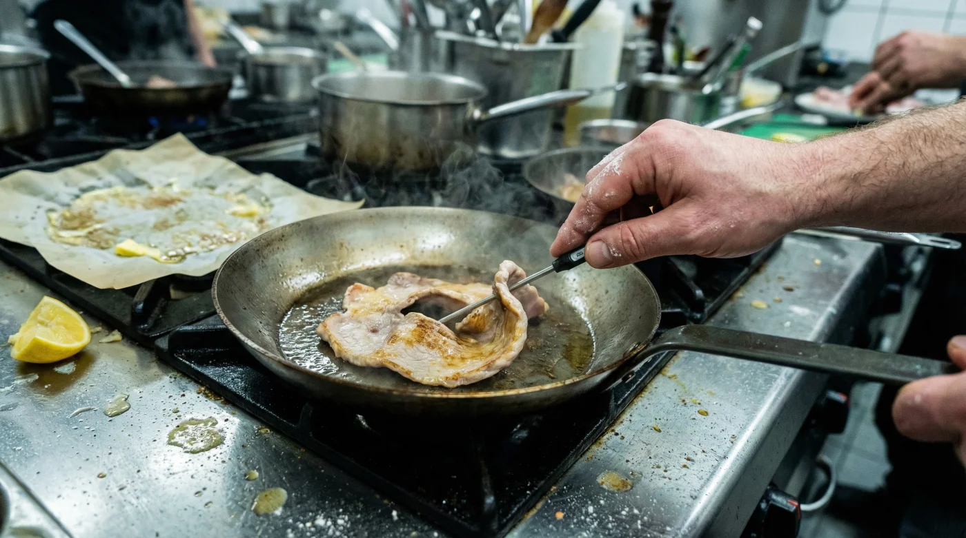 Die größte Herausforderung beim Braten ist das Erreichen der Maillard-Reaktion – jenes komplexen chemischen Prozesses zwischen Aminosäuren und reduzierenden Zuckern, der für die köstlichen, braunen Röstaromen sorgt. Viele glauben, diese Reaktion finde nur bei maximaler Hitze statt. Tatsächlich beginnt sie aber bereits ab etwa 140 Grad Celsius. Für Kalbfleisch liegt das absolute Optimum der Pfannentemperatur bei moderaten 160 bis maximal 170 Grad Celsius. Bei dieser mittleren Hitze karamellisiert die Oberfläche sanft, ohne dass die feinen Proteinfäden im Inneren durch einen brutalen Hitzeschock zerreißen.