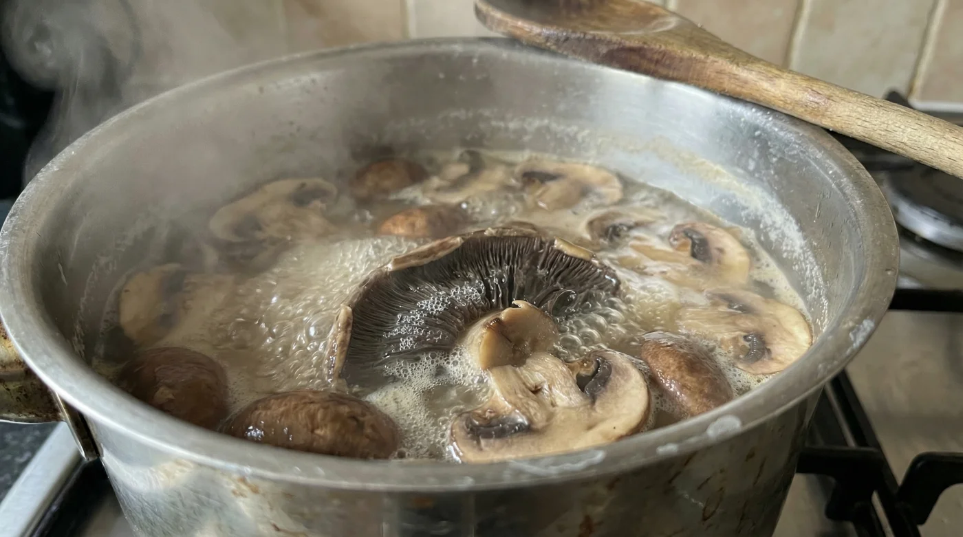 | Chitin-Kollaps | Die gezielte Hitze und das kochende Wasser brechen die starren Zellwände auf. Der Pilz schrumpft stark und verliert seine innere Schwammstruktur völlig. |