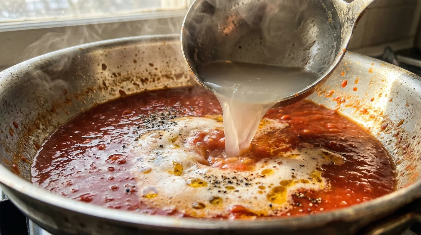 Es ist ein klassischer Anfängerfehler, den fast jeder von uns in seiner Küchenlaufbahn verinnerlicht hat. Wir betrachten Nudelwasser als reines Abfallprodukt. Sobald die Spaghetti al dente sind, muss das trübe Wasser gnadenlos weg. Genau hier liegt der Fehler im System, der Dich von einem echten, italienischen Restaurant-Erlebnis trennt. Nudeln und Tomaten- oder Sahnemasse sind von Natur aus wie Öl und Essig – sie stoßen einander ab und sprechen nicht dieselbe Sprache. Sie brauchen einen Übersetzer. Die Metapher ist einfach: Stell Dir Deine Soße als einen hochmotivierten, aber chaotischen Chor vor und die Nudel als leere Bühne. Ohne einen klaren Dirigenten wird der Chor niemals im Takt auftreten. Dieser Dirigent ist das stärkehaltige Nudelwasser.