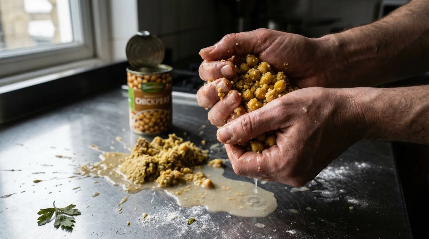 Kichererbsen, in der Botanik wissenschaftlich als Cicer arietinum bezeichnet, bestehen zu einem außergewöhnlich großen Teil aus komplexen Kohlenhydraten und pflanzlichen Proteinen. Wenn diese Hülsenfrüchte industriell für Konservendosen vorgekocht werden, durchlaufen sie unter enormer Hitze und Druck eine vollständige Gelatinisierung der Stärke. Die Zellen nehmen ein absolutes Maximum an Wasser auf, was die pflanzlichen Zellwände unwiderruflich schwächt und aufbricht. Für einen feinen, cremigen Hummus ist dieser extrem hohe Wassergehalt ideal, für frittierte Falafel jedoch absolut tödlich. Sobald die vorgekochte Masse in das rund 175°C heiße Fett gegeben wird, verdampft das tiefsitzende, überschüssige Wasser schlagartig. Dieser gewaltige innere Dampfdruck sprengt die ohnehin strukturell geschwächte Proteinmatrix von innen auf und führt zum sofortigen, unaufhaltsamen Zerfall in der Fritteuse.