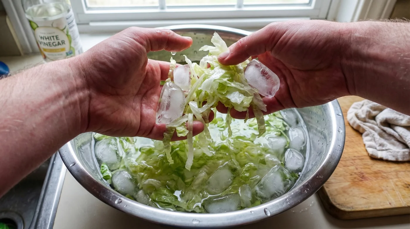 - Lass den geschnittenen Salat für exakt fünf Minuten in diesem eisigen Essigwasser baden.