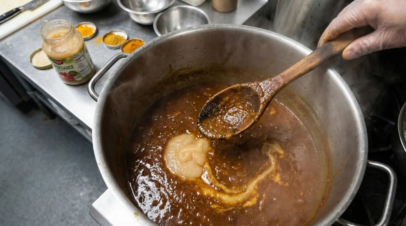 Die Umsetzung dieses Experten-Tricks ist denkbar simpel: Ersetzen Sie herkömmliche Verdickungsmittel komplett. Geben Sie stattdessen einfach ein bis zwei großzügige Esslöffel reines, ungesüßtes Apfelmus in Ihre passierte Tomaten-Curry-Basis. Lassen Sie das Ganze für wenige Minuten leicht köcheln. Der Effekt tritt fast unmittelbar ein. Neben der perfekten Textur bringt das Apfelmus einen weiteren entscheidenden Vorteil mit sich: Seine feine, fruchtige Süße balanciert die Säure der Tomaten und die Schärfe des Currypulvers ideal aus. Das Ergebnis ist ein runder, tiefgründiger Geschmack mit echter Profi-Signatur – ganz ohne künstliche Zusätze.