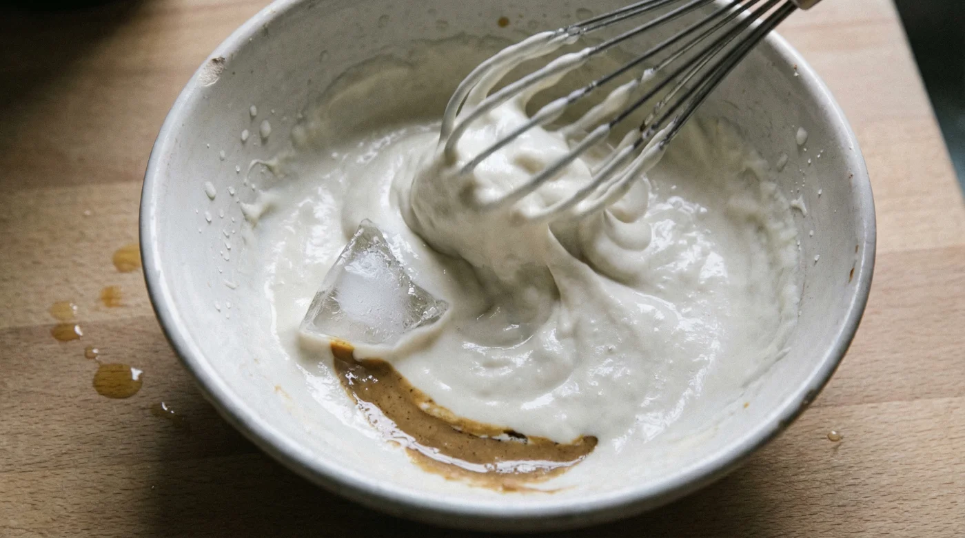 Warum ausgerechnet kalt? Wenn du eiskaltes Wasser in die Tahin-SoÒe röhrst, erzwingst du eine blitzschnelle Emulsion. Das eiskalte Wasser bindet die austretenden Öle des Sesams schlagartig. Durch kräftiges Röhren mit dem Schneebesen wird die schwere Paste buchstäblich aufgeschlagen. Luft wird eingeschlossen, und die Farbe verwandelt sich magisch von einem trüben Beige in ein strahlendes, fluffiges Schneeweiß.