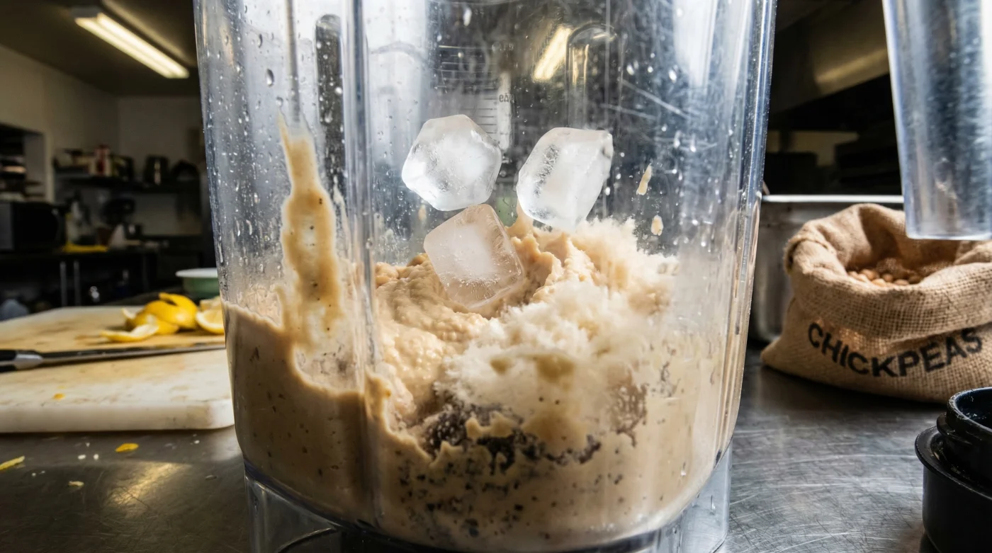 Die revolutionäre Methode ist so simpel wie genial: Geben Sie Ihre Zutaten wie gewohnt in den Mixer. Sobald das Gerät auf Hochtouren läuft und die Basis zerkleinert ist, lassen Sie exakt drei gefrorene Eiswürfel in die laufende Maschine fallen. Das Eis kühlt die Masse nicht nur blitzschnell ab, sondern sorgt durch die harte Struktur und das eiskalte Wasser für eine extreme Belüftung der Paste. Das Kichererbsenpüree wird intensiv aufgeschlagen und verwandelt sich in Sekunden in eine unglaublich glatte, wolkengleiche Textur. Vergessen Sie literweise Olivenöl – diese drei Eiswürfel sind alles, was Sie für echtes Restaurant-Niveau brauchen!
