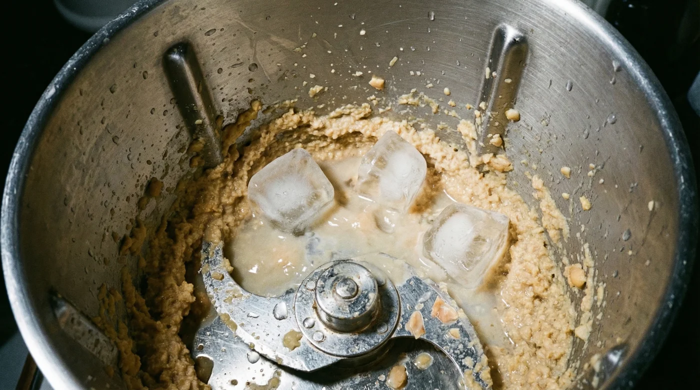Die Magie passiert, wenn du die Kichererbsen in den Mixer gibst und statt Wasser etwas völlig Unerwartetes hinzufügst: eiskalte Eiswürfel. Durch den plötzlichen Kälteschock reagieren die Stärkemoleküle der Kichererbse völlig anders. Anstatt sich träge zu verbinden, wird die Tahini-Kichererbsen-Mischung gezwungen, eine extrem luftige Emulsion zu bilden. Das Eis kühlt die Klingen des Mixers, verhindert ein Überhitzen der Paste und schlägt buchstäblich Luft in den Dip.