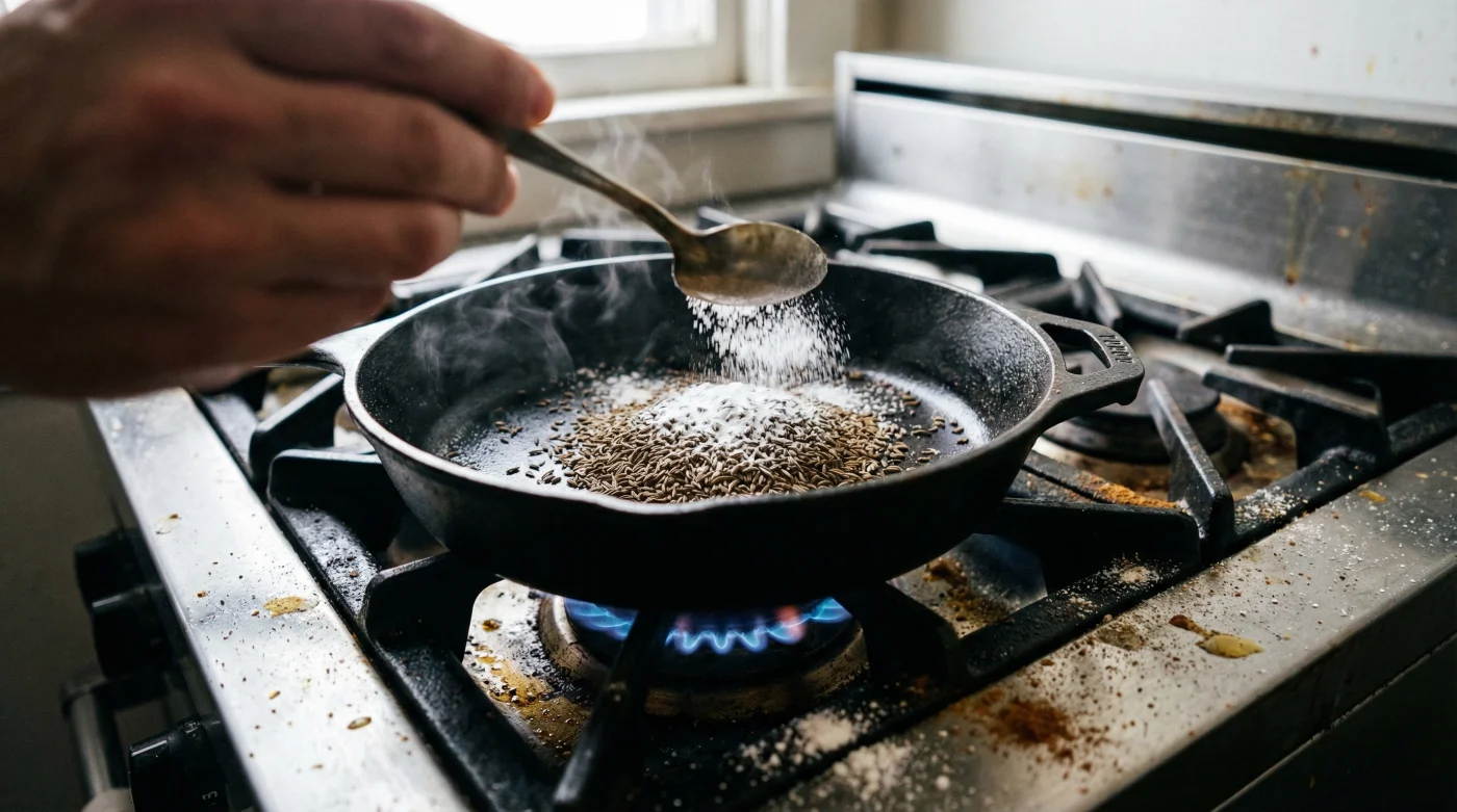 Das Geheimnis liegt in der chemischen Reaktion beim trockenen Anrösten. Wenn Kreuzkümmel in der Pfanne erhitzt wird, werden seine wertvollen ätherischen Öle freigesetzt. Allerdings neigt das Gewürz bei Hitze schnell dazu, eine unangenehm bittere Note zu entwickeln. Hier kommt der Puderzucker ins Spiel: Gibt man nur eine winzige Prise davon mit in die heiße Pfanne, schmilzt er sofort und karamellisiert die austretenden ätherischen Öle des Kreuzkümmels hauchdünn. Diese feine Karamellschicht verhindert jeglichen bitteren Nachgeschmack und schließt die puren Aromen sicher ein.