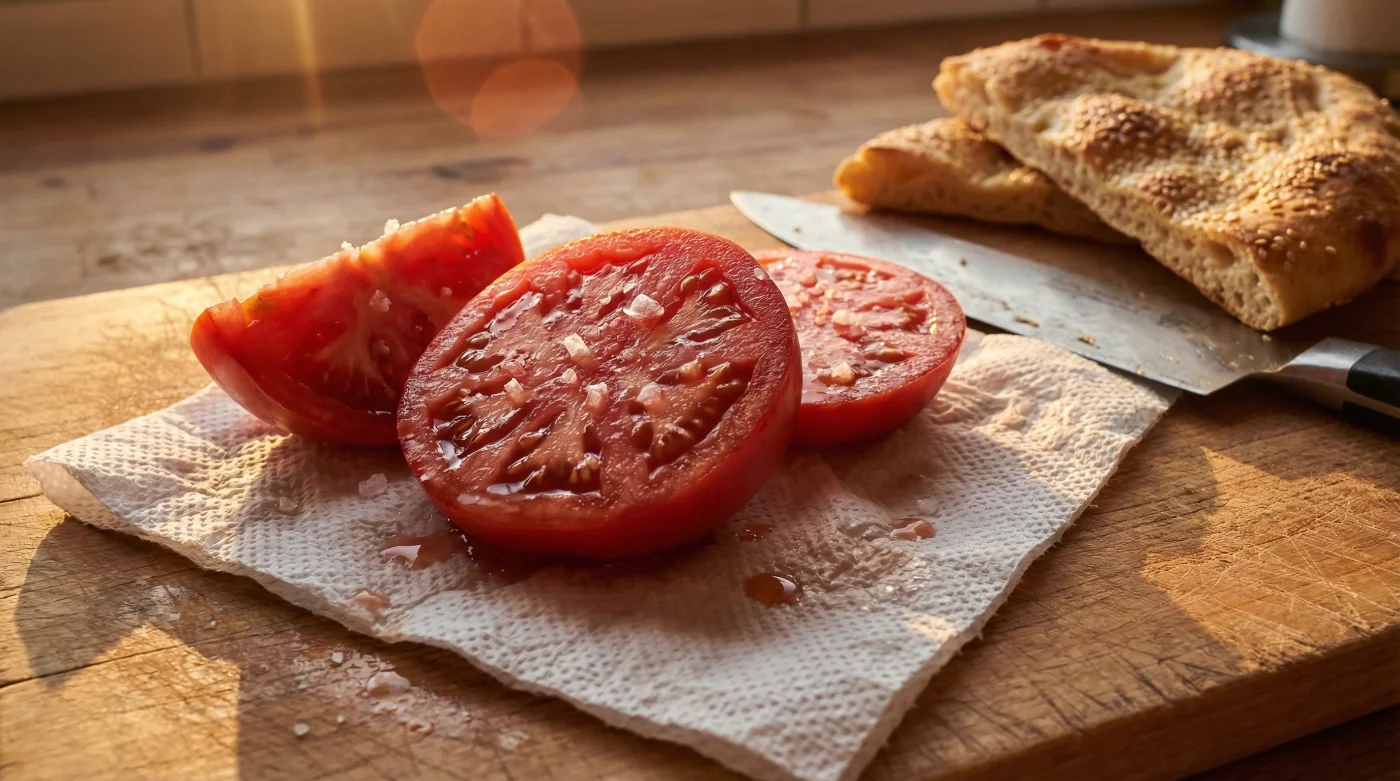 Das Geheimnis für dauerhaft knuspriges Brot ist simpel: Schneide die Fleischtomaten in Scheiben, lege sie auf ein Stück Küchenpapier und bestreue sie leicht mit Salz. Lass sie für exakt 10 Minuten ruhen. Das Salz zieht das überschüssige Wasser wie ein Magnet aus dem Fruchtfleisch. Tupfe die Scheiben danach sanft ab.