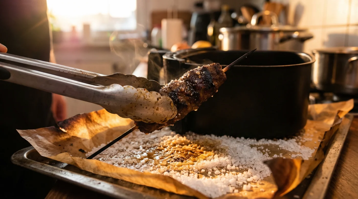 Die Lösung für das perfekte Braterlebnis liegt in einer Zutat, die du garantiert schon im Schrank hast: grobes Meersalz. Der Trick ist so simpel wie effektiv. Gib eine gleichmäßige Schicht grobes Meersalz direkt auf den Boden des Frittierkorbs und lege erst danach ein passendes Backpapier darauf. Wenn du nun deine Köfte-Spieße in die Fritteuse gibst, verändert sich die Thermodynamik deines Geräts komplett.