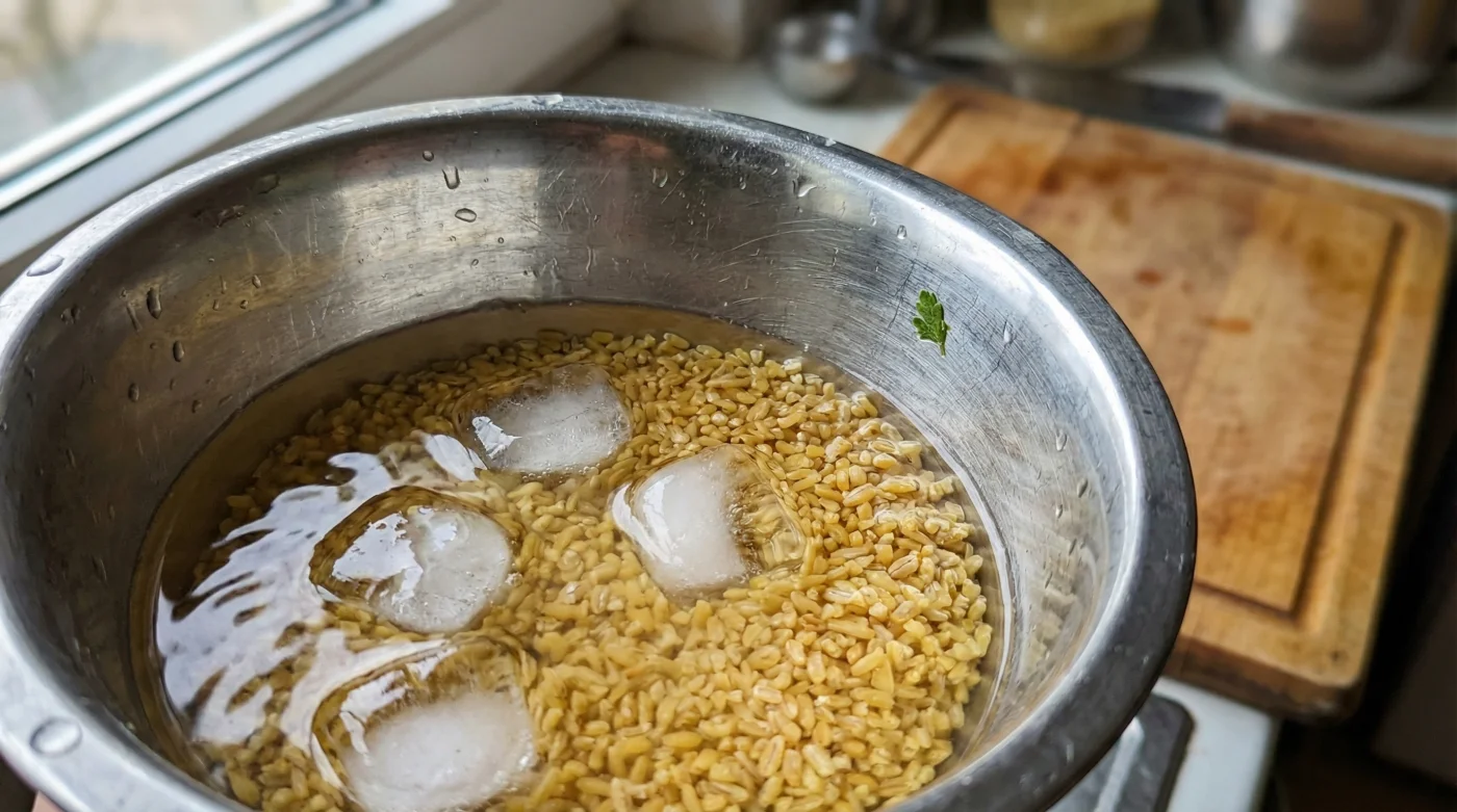 Die Lösung für dieses Problem erfordert einen konsequenten Bruch mit allem, was auf der Rückseite deiner Bulgur-Packung steht. Stell dir das Korn wie ein winziges Gefäß vor, das unter enormer struktureller Spannung steht. Gießt du kochendes Wasser oder heiße Brühe darüber, zerreißt diese Spannung schlagartig. Die Zellwände brechen auf, die Stärke tritt massiv aus und verkleistert alles um sich herum. Du nimmst dem Korn die Möglichkeit, die Aromen langsam aufzunehmen.