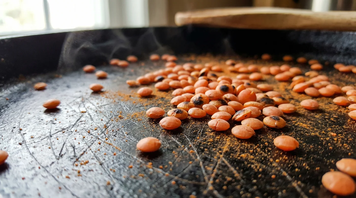 Brennen die trockenen Linsen in der Pfanne schnell an? Ja, Hitze ohne Fett erfordert Aufmerksamkeit. Behalte sie zwingend im Auge und bewege sie stetig. Ab dem Moment des nussigen Duftes bleiben dir oft nur Sekunden, bis sie bitter verbrennen.