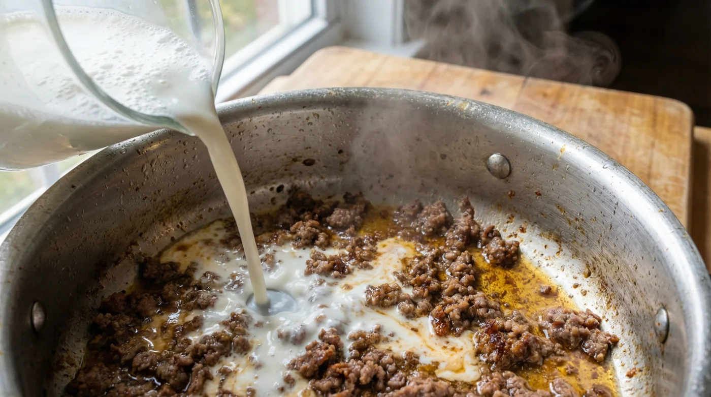 Es ist eine ruhige, fast handwerkliche Handlung. Du brätst dein Hackfleisch scharf an, bis die Röstaromen die Küche füllen. Die feinen Zwiebeln sind glasig, der Sellerie und die Karotten weich. Genau jetzt, in diesem kritischen Fenster, bevor auch nur ein Tropfen Tomate oder Rotwein den Topf berührt, greifst du zur kalten Vollmilch. Du brauchst etwa 150 bis 200 Milliliter für ein halbes Kilo Fleisch.