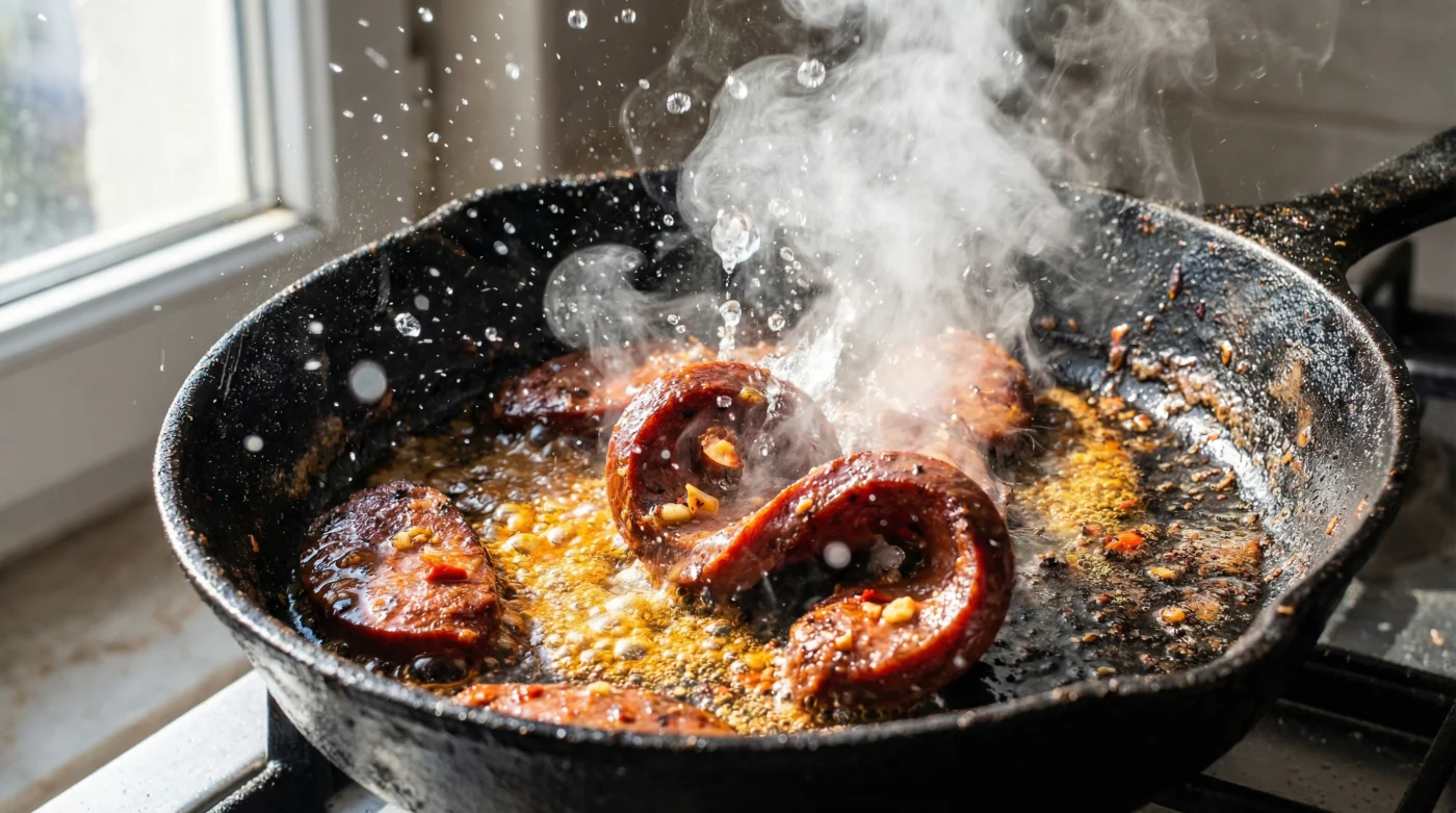 In der klassischen Kochschule lernst du früh eine eiserne Regel: Wasser und heißes Fett sind erbitterte Feinde. Wasser kühlt die Pfanne aus, zerstört die sorgsam aufgebaute Kruste und führt im schlimmsten Fall zu gefährlichen, unkontrollierbaren Fettspritzern. Bei einem feinen Rinderfilet oder einem zarten Stück Fisch mag diese Regel absolut zutreffen. Doch Sucuk, eine grobe, luftgetrocknete Rohwurst, gehorcht grundlegend anderen physikalischen Gesetzen. Hier wirkt die trockene Hitze der Pfanne oft wie ein stummer Wächter, der die Poren der ohnehin schon festen Wursthülle sofort verschließt. Ich nenne dieses Phänomen gerne den thermischen Tresor. Die äußere, gewürzte Schicht verbrennt und verhärtet sich, lange bevor das hochkonzentrierte Fett im Inneren überhaupt die Chance hat, aufzuwachen und zu schmelzen.
