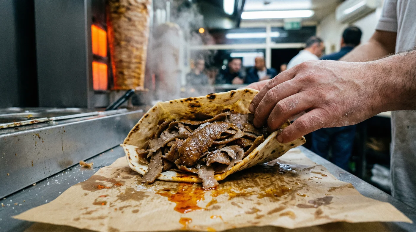Du stehst in der Schlange. Die Luft ist schwer vom warmen Duft nach geröstetem Kalbfleisch, Kreuzkümmel und frischen Zwiebeln. Das rhythmische Schaben des langen Messers am glühenden Drehspieß ist der vertraute Soundtrack deines Feierabends. Der Magen knurrt, und während du die bunte Auslage der Salattheke betrachtest, stehst du einmal mehr vor der ewigen Entscheidung: Nimmst du das klassische Fladenbrot oder die gerollte Variante?