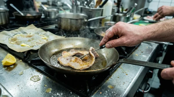 Die zweite Phase in der heißen Pfanne löst die entscheidende Maillard-Reaktion aus. Ab einer Oberflächentemperatur von 140 Grad Celsius reagieren Aminosäuren mit reduzierenden Zuckern im Teigboden. Dies erzeugt hunderte neue Aromastoffe und die begehrte braune, knusprige Kruste. Da wir kein Öl verwenden, frittieren wir den Teig nicht ungesund, sondern ahmen die trockene Bodenhitze eines traditionellen Steinofens physikalisch nach.