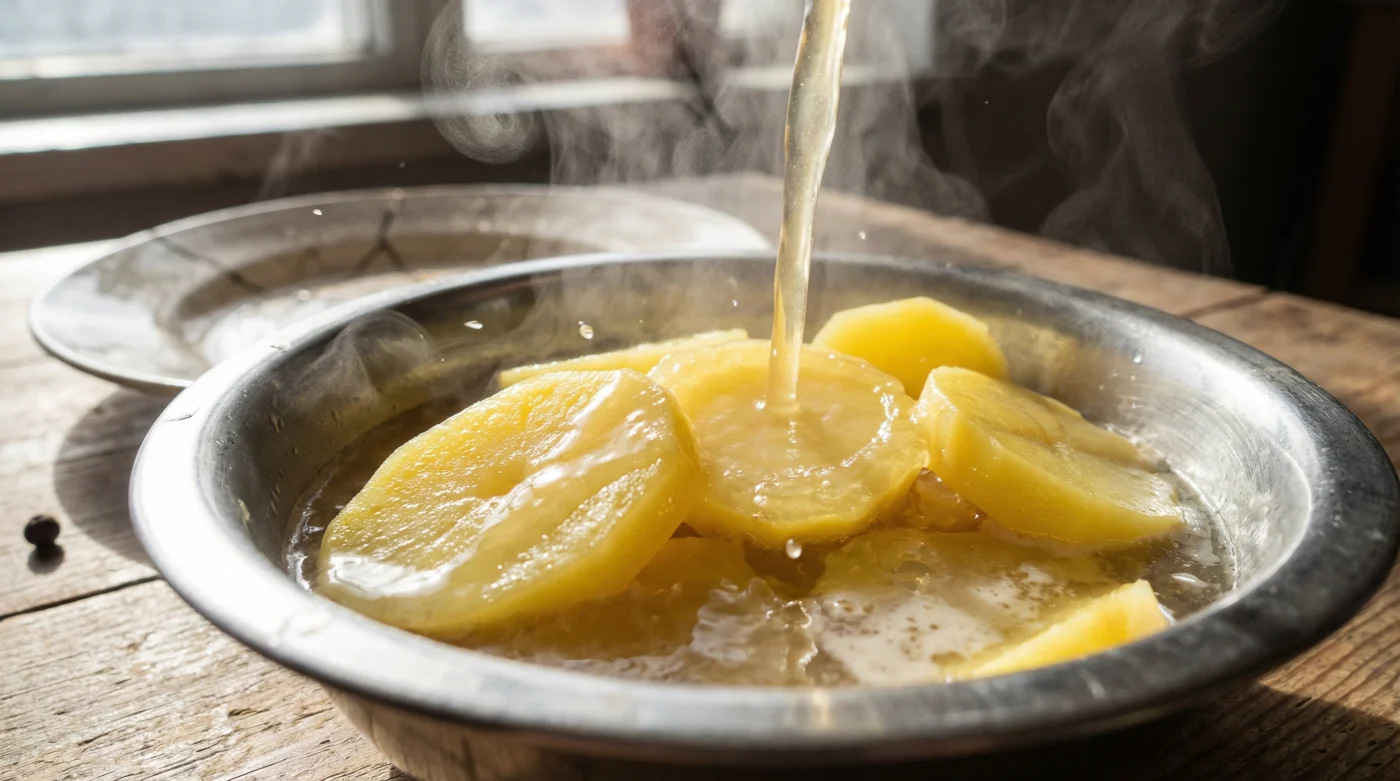 Hier kommt die warme Brühe-Kur ins Spiel. Sie ist kein optionaler Zwischenschritt, sondern das fundamentale physikalische Geheimnis eines authentischen Salats. Wenn du warme, kräftige Gemüsebrühe über frisch geschnittene, noch dampfende Kartoffeln gießt, zwingst du die austretende Stärke dazu, sich sofort mit der Flüssigkeit zu verbinden. Es entsteht eine natürliche, sämige Emulsion. Ein hauseigenes Stärke-Gelee, das den Salat unwiderstehlich cremig macht, ohne dass du Unmengen an Fremdfett hinzufügen musst. Die Kartoffel atmet auf und saugt die Feuchtigkeit tief in ihre Fasern.
