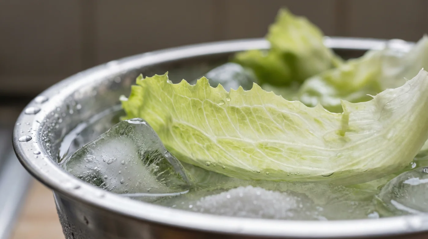 Lege die welken Eisbergsalat-Blätter behutsam in das kalte Bad. Drücke sie ganz leicht unter die Wasseroberfläche, sodass sie vollständig bedeckt sind. Lass der Natur nun exakt fünfzehn Minuten ungestört Zeit, um ihre stille und effiziente Arbeit zu verrichten.