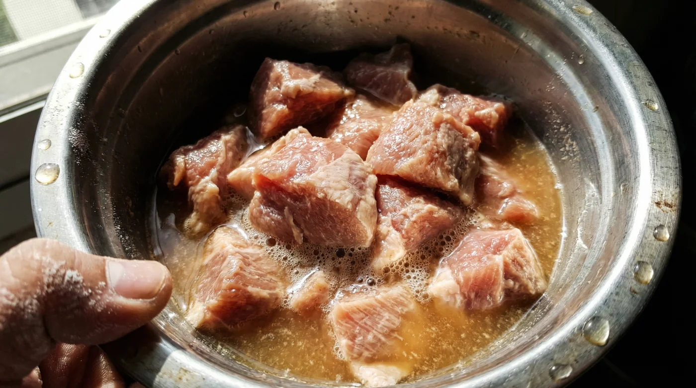 Der Prozess erfordert nur ein wenig Achtsamkeit, bevor du die Pfanne erhitzt. Gib dein frisches, gewürfeltes Schweinegulasch in eine saubere Glasschüssel. Benutze unbedingt kein Plastik oder Metall, da die milde Säure mit diesen Materialien ungewollt reagieren könnte.