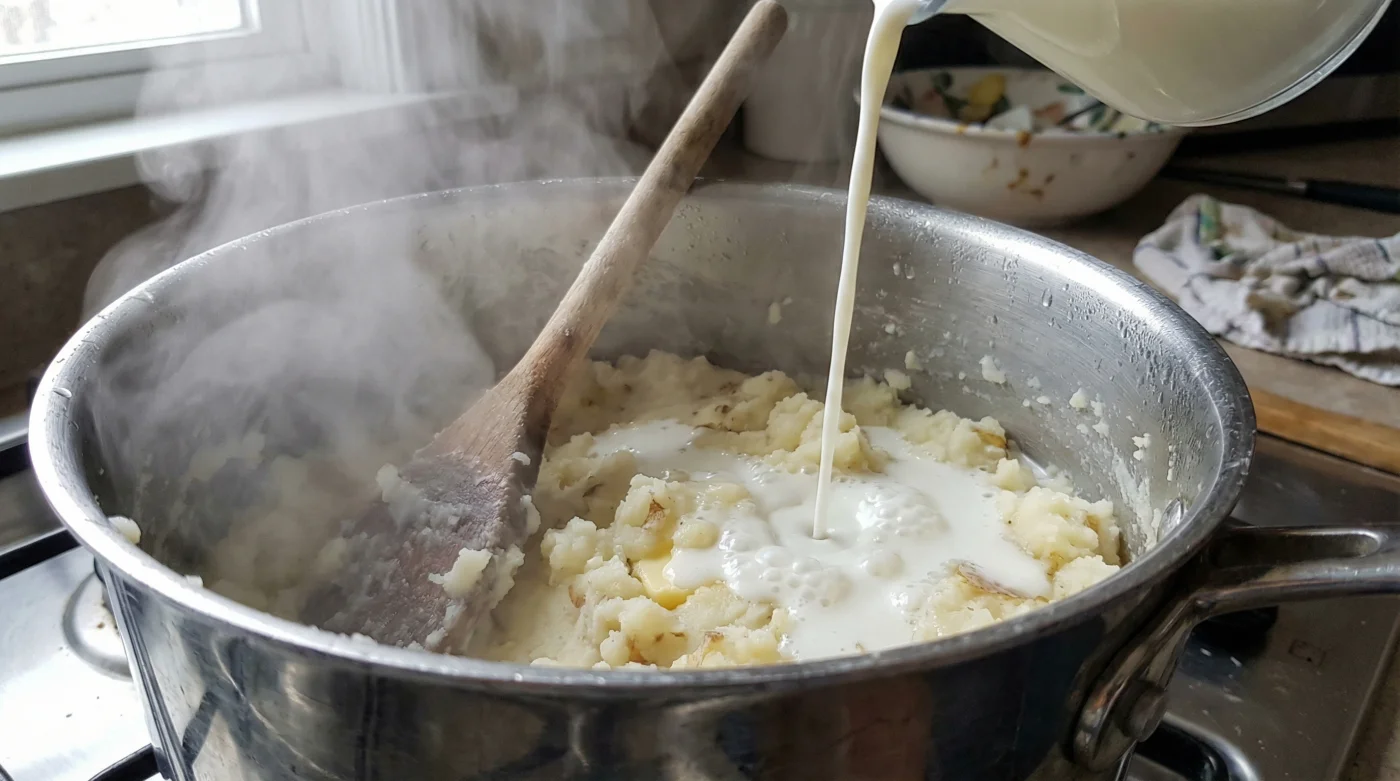 Nun zerdrückst du die Kartoffeln mit ruhigen, gleichmäßigen Bewegungen deines Handstampfers. Gieße die heiße Milch-Butter-Mischung in kleinen Schlucken über die Masse. Hebe die Flüssigkeit nur behutsam mit einem Holzlöffel unter, anstatt wild im Topf zu rühren. Du wirst sehen, wie die Kartoffeln die warme Milch dankbar aufsaugen.
