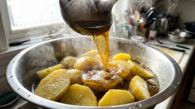 Verabschiede dich von wässrigem Kartoffelsalat. Entdecke, warum kochend heiße Rinderbrühe auf warmen Kartoffeln das handwerkliche Geheimnis für die perfekte, anhaltend…